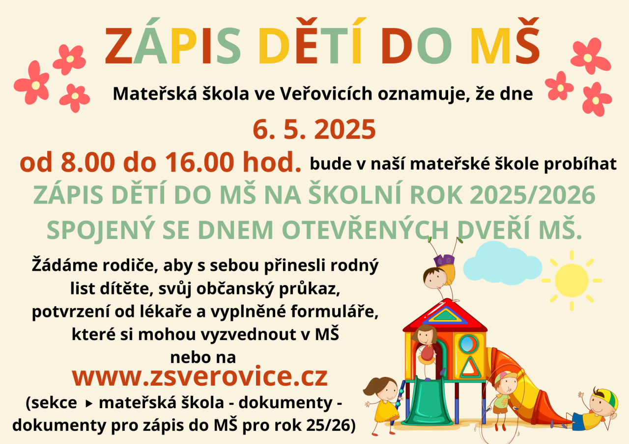 Mateřská škola ve Veřovicích oznamuje, že dne 6. května 2025 od 8.00 do 16.00 hod. se bude konat zápis dětí do MŠ na školní rok 2025/2026. Tento den bude spojen s dnem otevřených dveří. Rodiče jsou žádáni, aby si s sebou přinesli rodný list dítěte, občanský průkaz, potvrzení od lékaře a vyplněné formuláře, které si mohou vyzvednout přímo v mateřské škole nebo na webových stránkách školy.