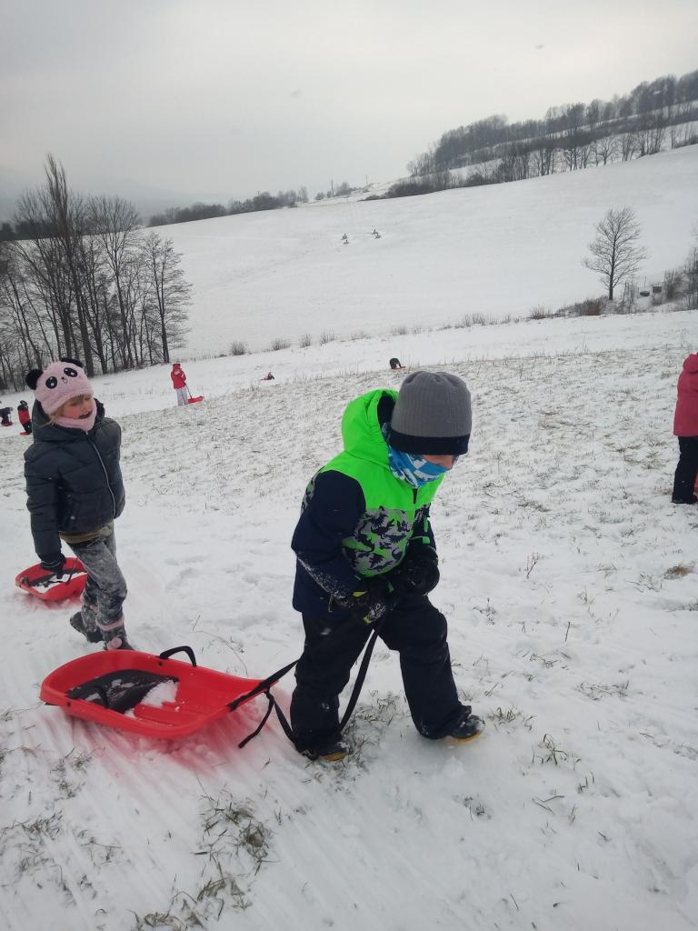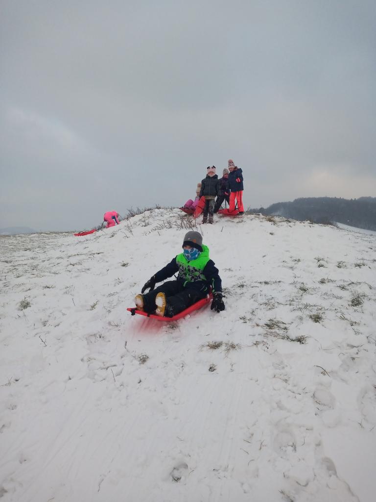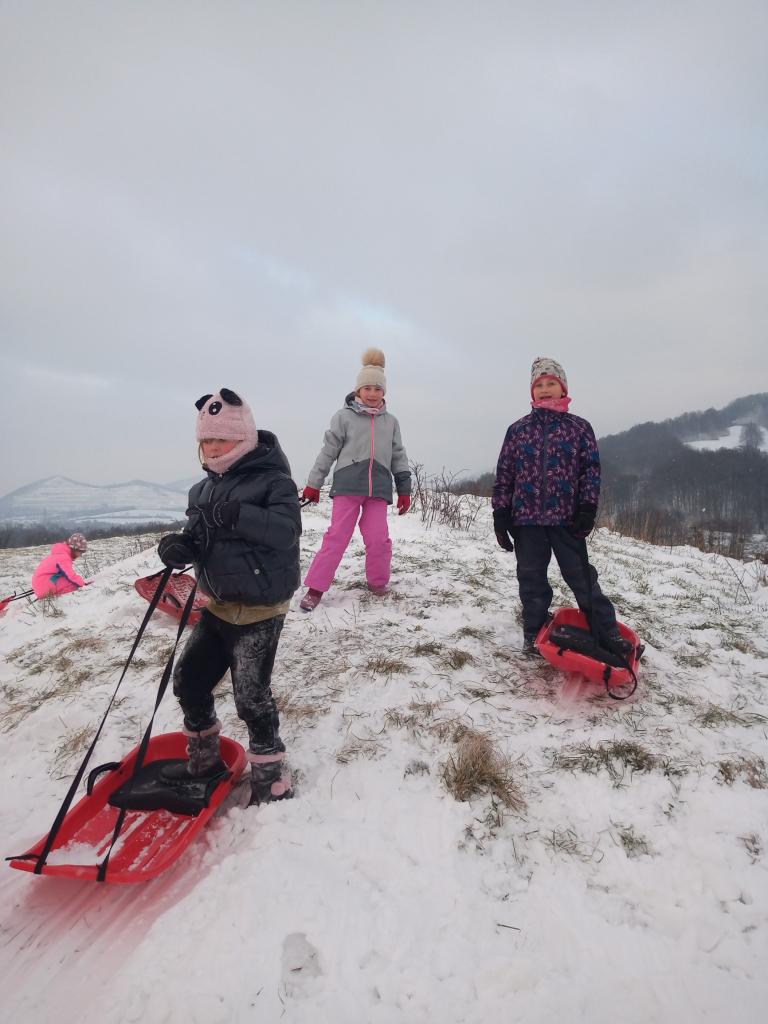 V lednu jsme si s dětmi družiny užívali venku, co to jen šlo. Nejlepší to bylo na sněhu na svahu. Každý si našel to svoje. Někdo si vystačil s teplou kombinézou a nemohl se nabažit válení sudů ve sněhu, jiný se s kamarády kouloval nebo se tvořili sněhuláci a jiné sněhové sochy či stavby apod. Nejvíce se ale využívaly školní boby, které byly kdykoli k dispozici posloužit klukům a holkám dle libosti. Bylo zajímavé pozorovat, jak se uměli domluvit a sestavovali různé vláčky a jiné formace a za jízdy je pak rozpojovali. Výskot a jásot zněl okolo a dovádění nebralo konce. Šťastně unavení se děvčata a chlapci vraceli do družiny.