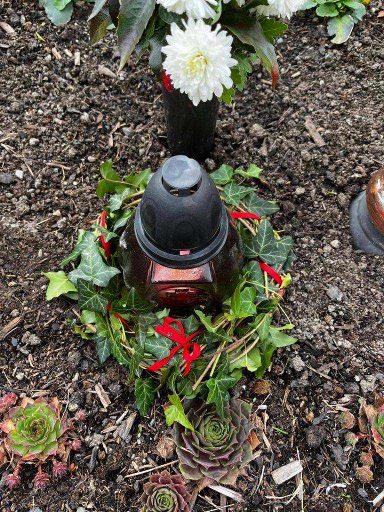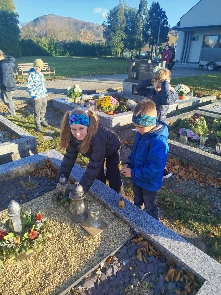 Druhá akce se týkala našich Dušiček, kdy myslíme na naše drahé zemřelé. Vloni se návštěva hřbitova setkala s nadšením, tak nebyl důvod ji opět nezopakovat. Nejprve jsme si povídali o členech rodiny a hlavně o těch, které už máme jen ve vzpomínkách. Poté jsme vyrobili z nasbíraných přírodnin jednoduché věnečky a vyrazili k místnímu hřbitovu. Svým chováním se snažili chlapci a dívky vyjádřit úctu na tomto pietním místě - ozdobili hroby, zapálili svíčky a s dobrým (trochu tajemným) pocitem se vrátili zase do školy.