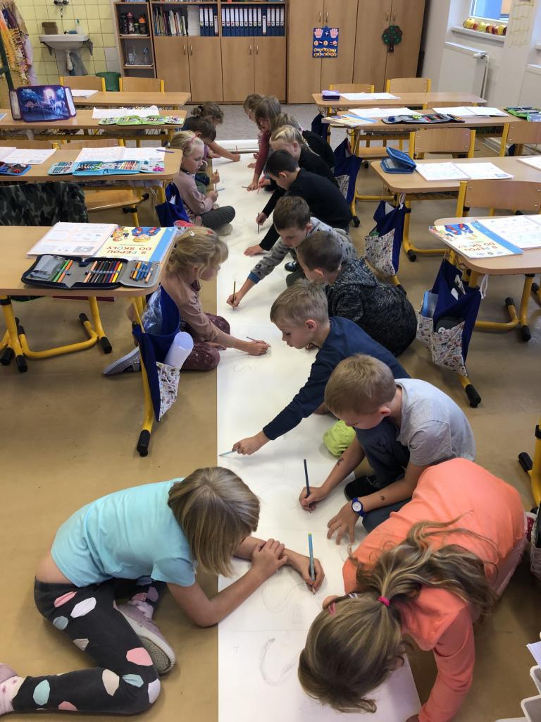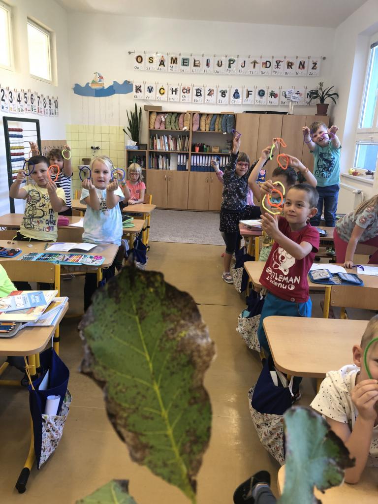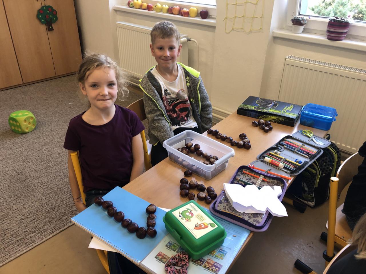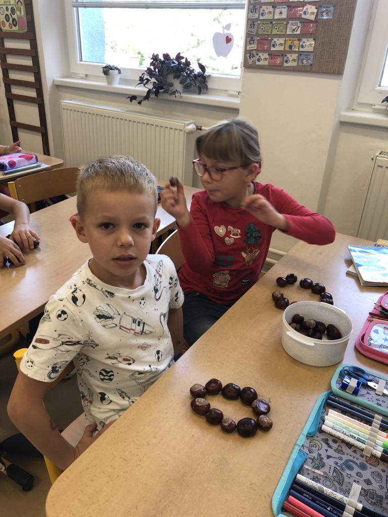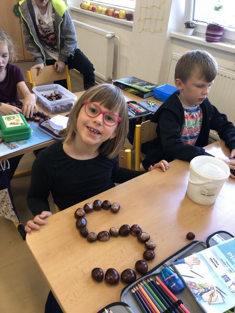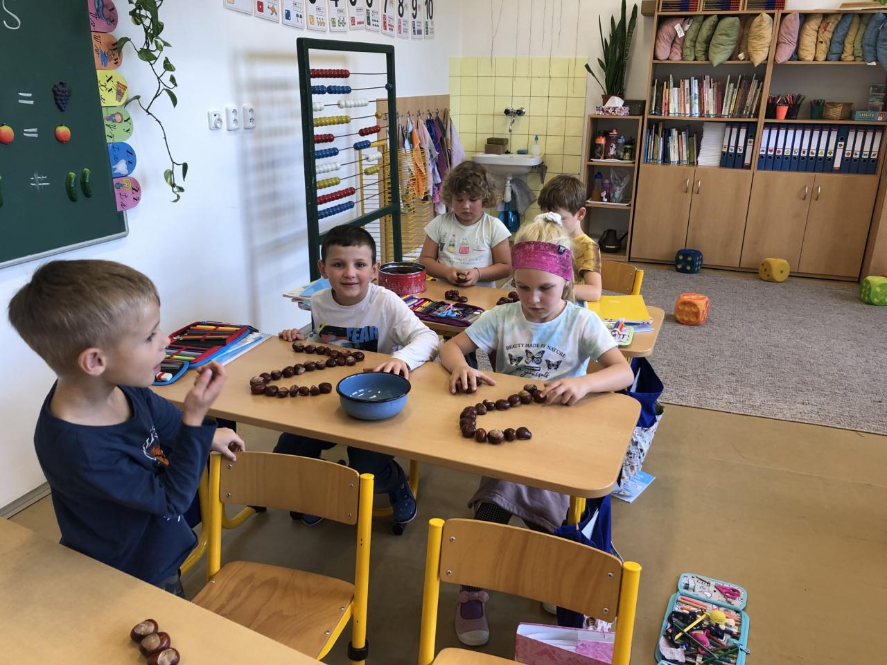 Od prvních dnů jsme se pustili do práce, protože té je v první třídě opravdu mnoho. Intenzivně pracujeme na rozvoji zrakové a sluchové percepce, abychom byli co nejlépe připraveni na čtení a pilně nacvičujeme uvolňovací cviky, aby nám to pak do písanky šlo jako po másle. Úderem října jsme se vrhli na písmenka, psaní číslic a pořádné počítání. Také už jsme si stihli popovídat a prozkoumat, jak se nám mění příroda na podzim, snažíme se umět pojmenovat co nejvíce druhů ovoce a zeleniny. Při té příležitosti jsme si udělali poznávačku se zavřenýma očima, a to teda byla zábava. Snažíme se využít všechno, co nám podzimní příroda nabízí a naši velmi oblíbenou činností je práce s kaštany. Než je doneseme zvířátkům, tak je s radostí využíváme při počítání i při psaní. Máme za sebou větší polovinu plaveckých lekcí a i tam děláme velké pokroky.