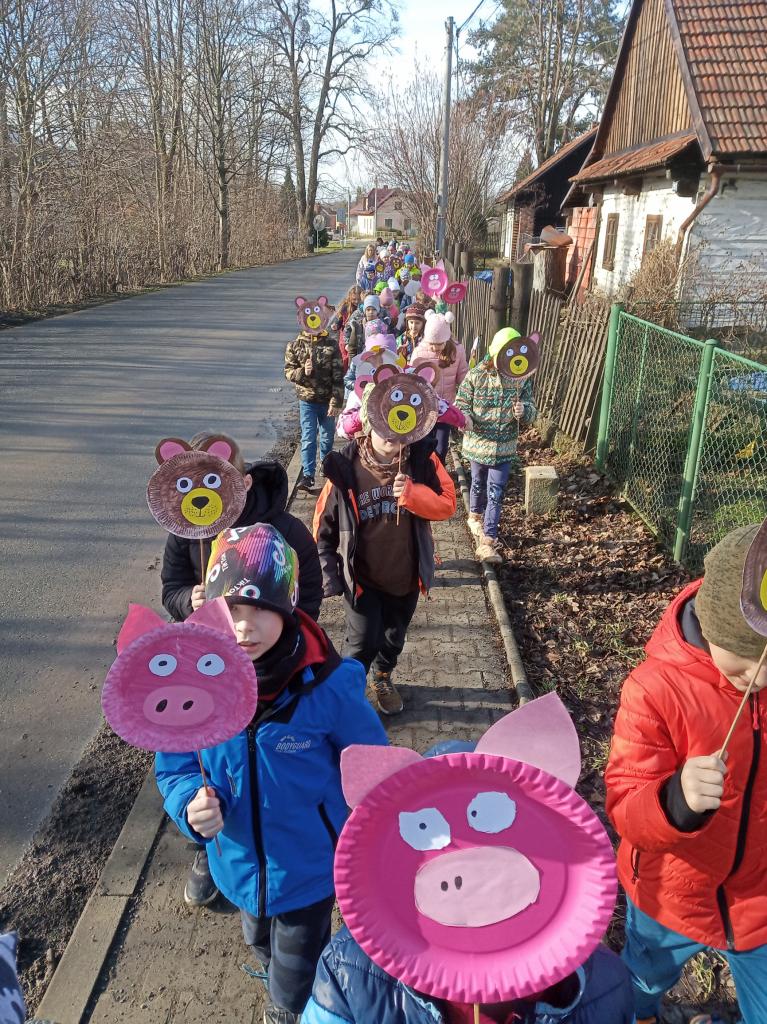Masopustní oslavy začaly ve školních prostorách a v jídelně, kde děti zazpívaly masopustní píseň v doprovodu houslí, flétny a dalších hudebních nástrojů. Poté se odvážily vyjít v průvodu také i do veřejných prostor, jako je obecní úřad, školka a mateřská škola Orlíček, kde svou radostnou energií rozveselili i ty nejmenší.