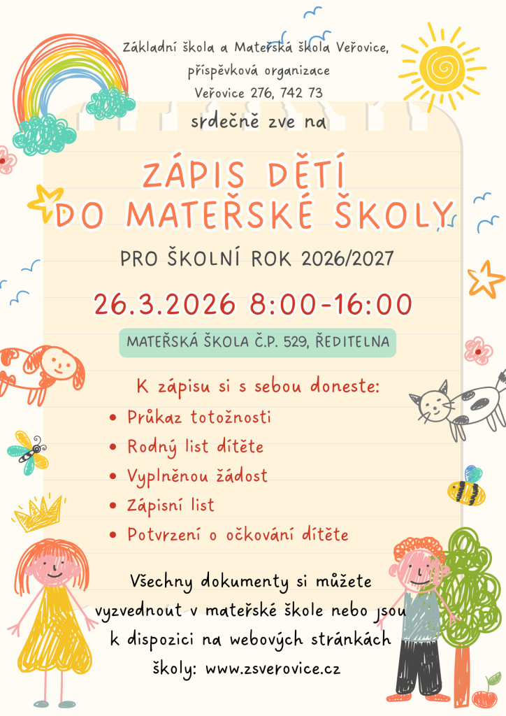 ZÁPIS DĚTÍ DO MATEŘSKÉ ŠKOLY PRO ŠKOLNÍ ROK 2026/2027